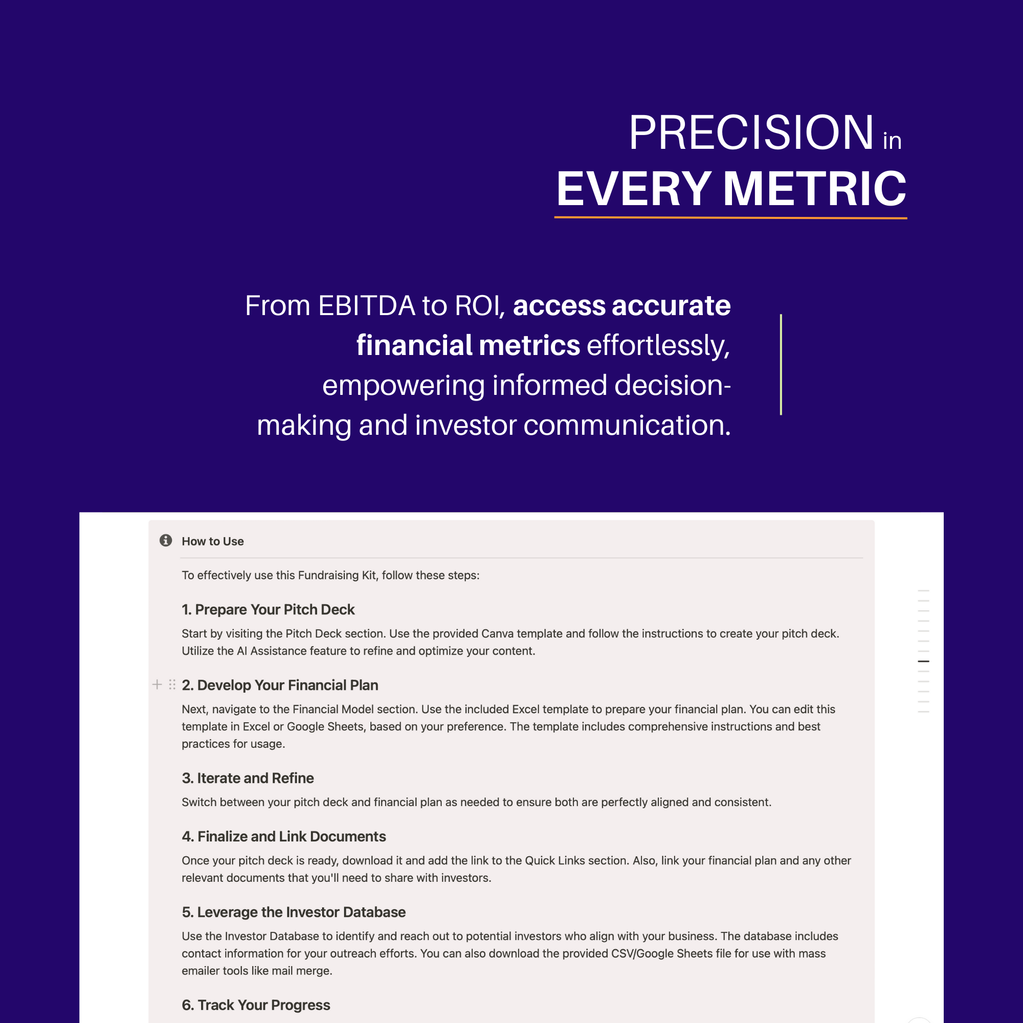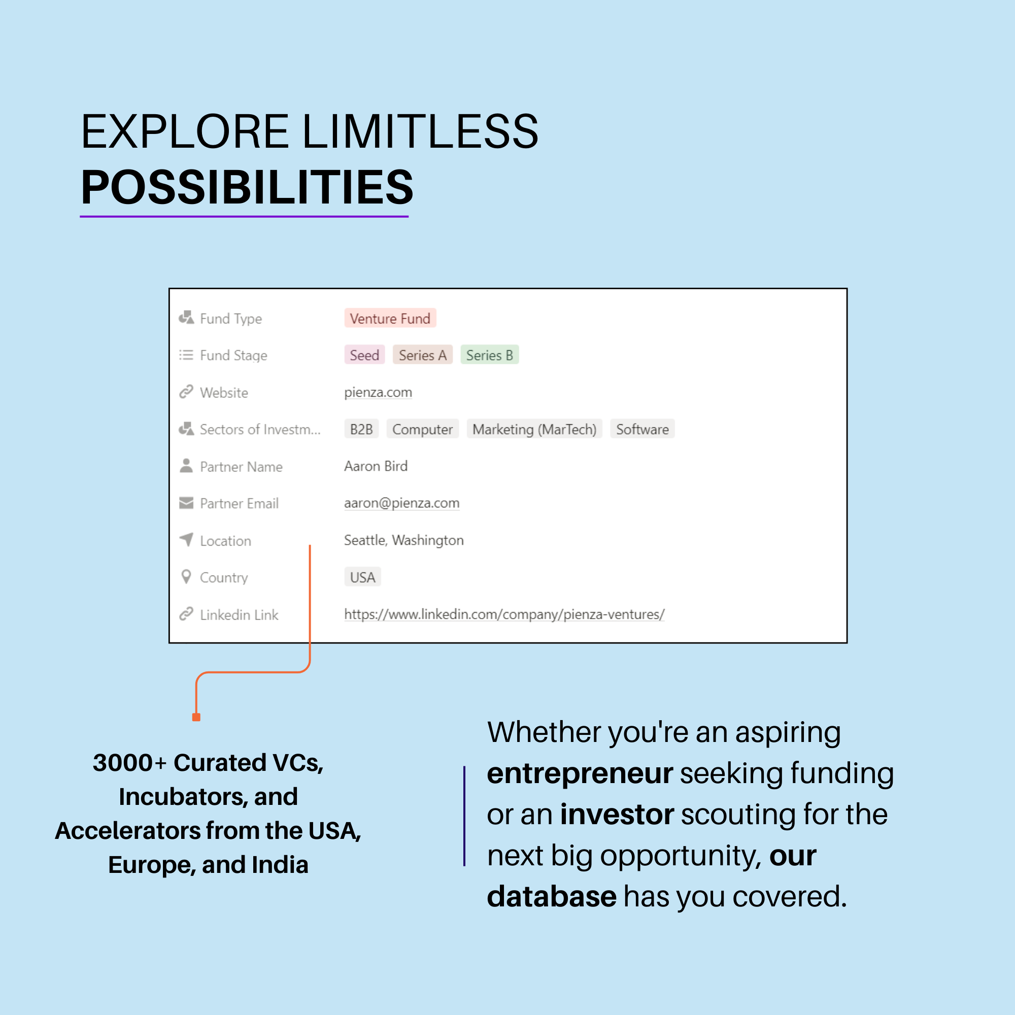 Complete Fundraising Solution: Obtain all the necessary tools in one package – an AI-assisted Notion landing page, a professionally crafted pitch deck template, a comprehensive financial model, and a curated investor database featuring over 3000 venture capitalists (VCs), incubators, and accelerators from the USA, Europe, and India.
