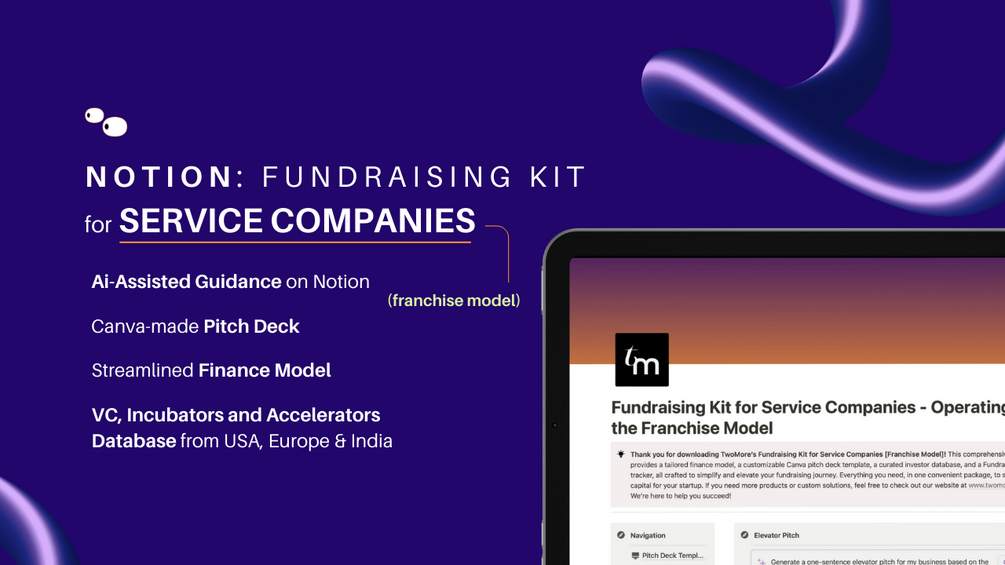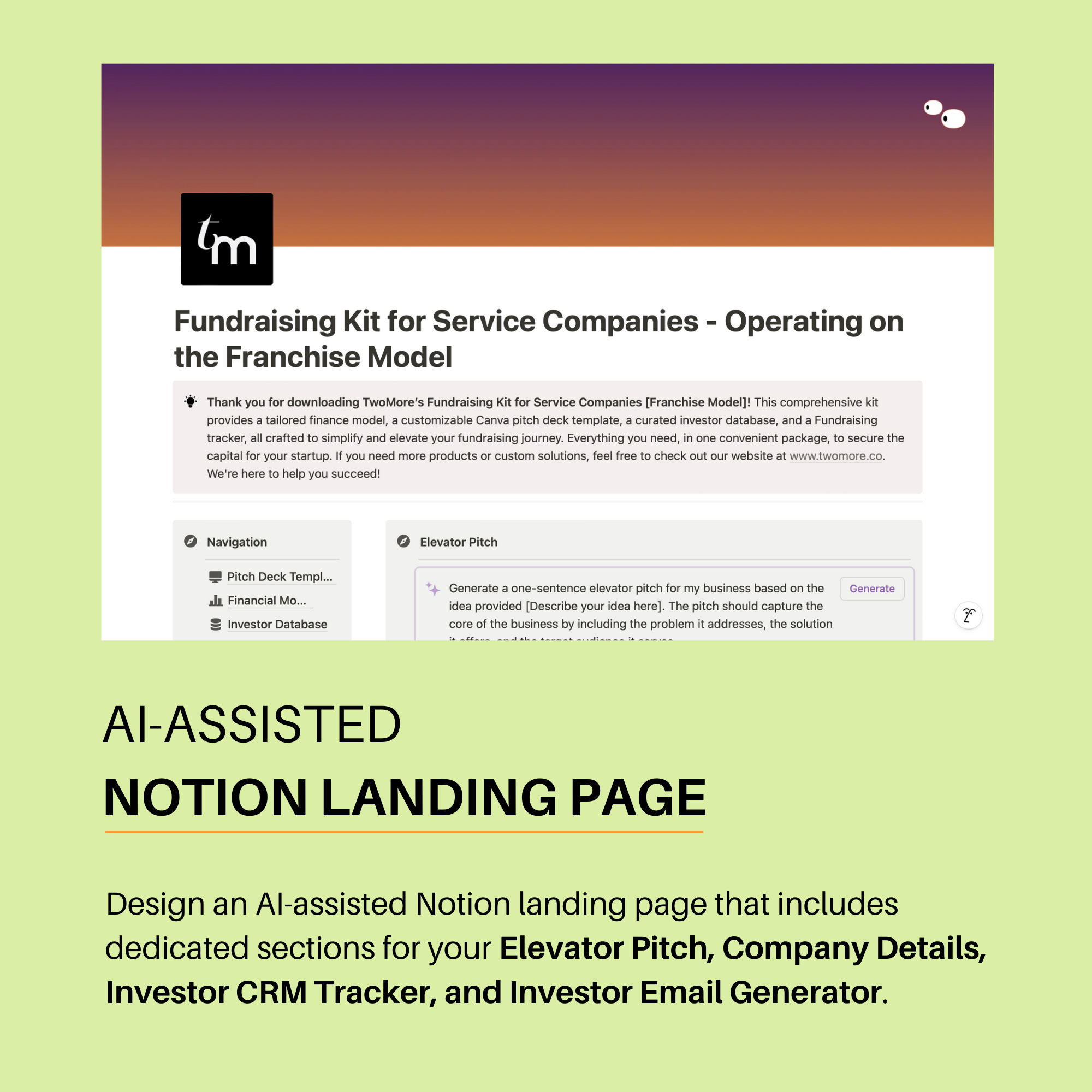 Tailored explicitly for service-based businesses leveraging the franchise model, this Notion AI-assisted fundraising Kit equips you with essential resources to secure funding and drive expansion. This kit combines a professionally crafted pitch deck, comprehensive financials, and a curated investor database, specifically designed for service companies. With these resources, you'll confidently present your business to potential investors and accelerate your growth.