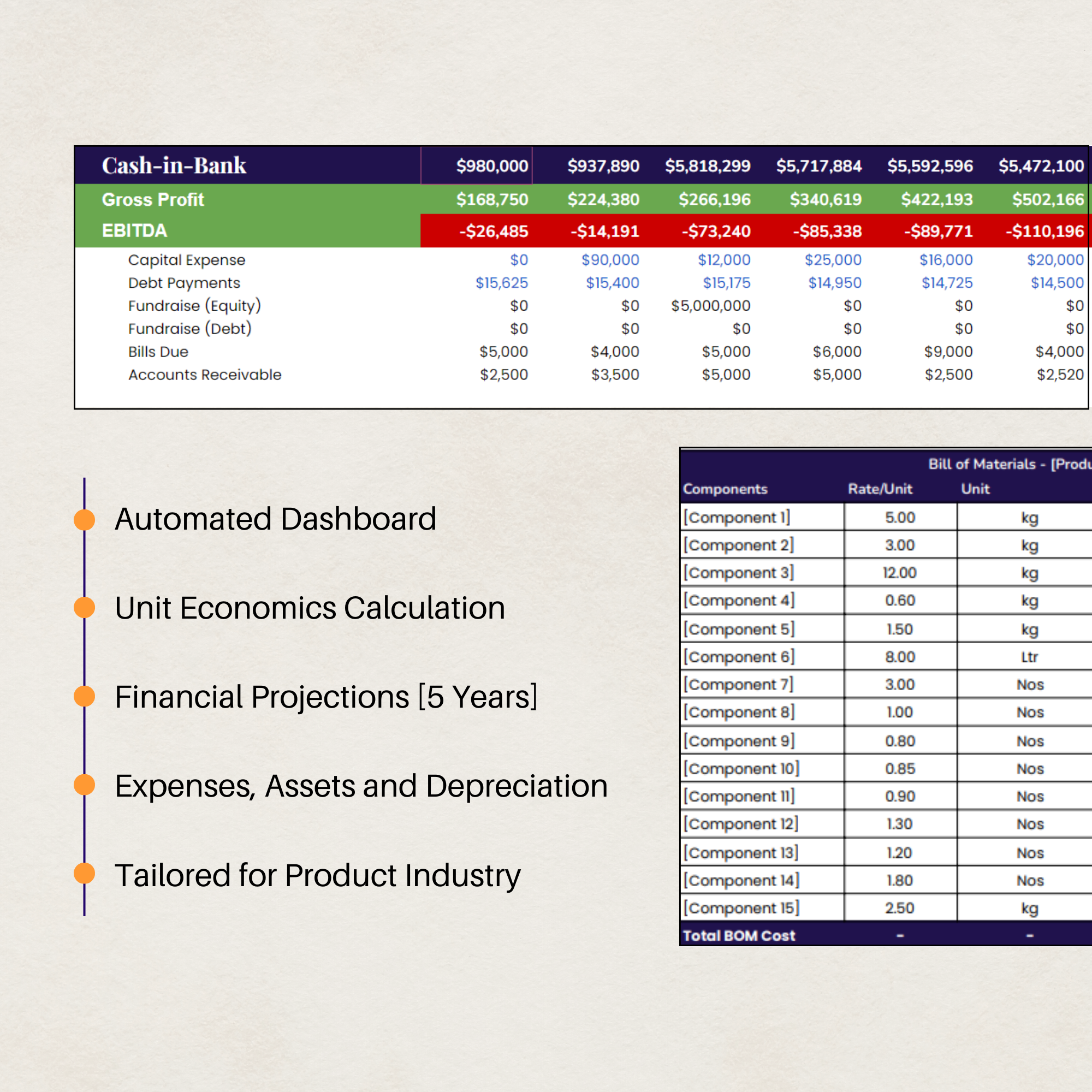 Excel Model with Instructions: The kit includes an Editable Excel/Google Sheets finance model with clear instructions. It comes with a Fully Automated Dashboard and interconnected sections like Unit Economics, 5-year Projections, Teams & Salaries, CapEx and Depreciation, etc. We've already built all the formulas needed to make your task much easier!