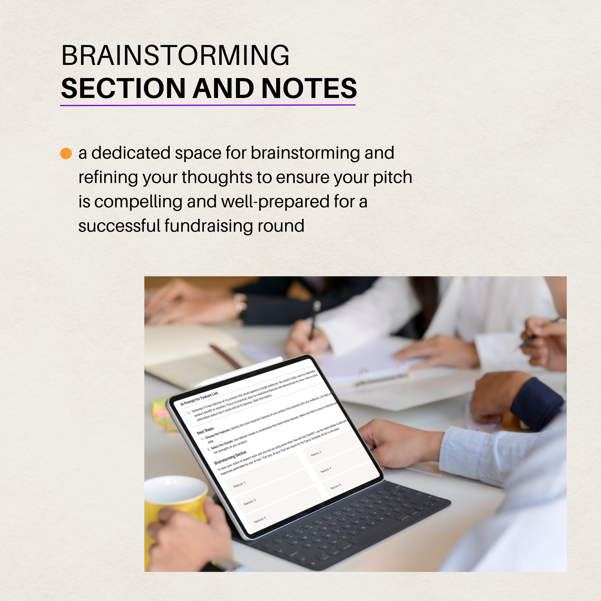 Dedicated Brainstorming Section: Refine your pitch with a dedicated space for brainstorming, allowing you to organize your thoughts and create persuasive content before transferring it to your Canva slides.